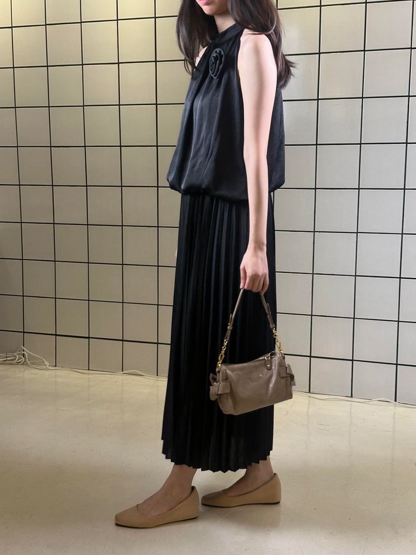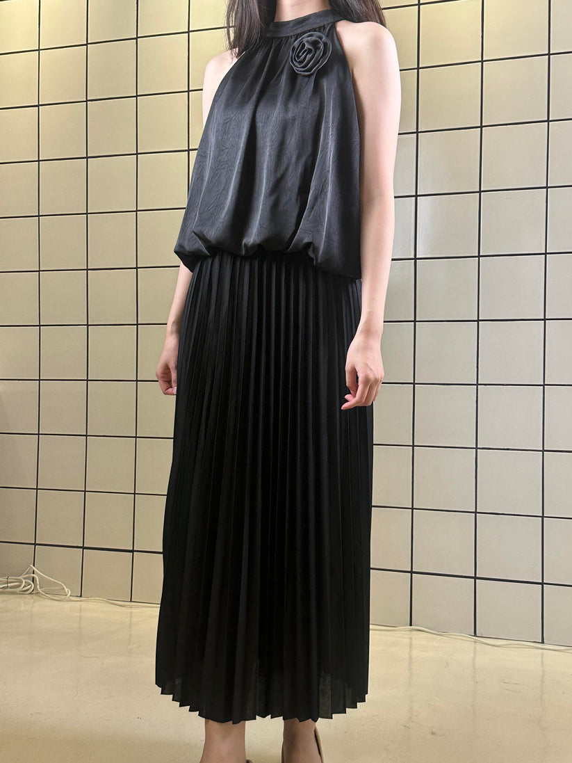 An elegant halter neck top designed with soft gathers and a fluid drape, finished with a color-matching rose appliqué secured by a removable safety pin. Crafted from a lightweight satin-finish fabric, this sleeveless top offers a relaxed silhouette with a gently elasticated hem, making it easy to style tucked or bloused. Ideal for evening wear, formal occasions, or polished day-to-night looks.