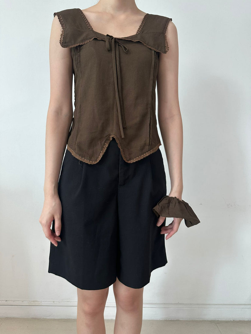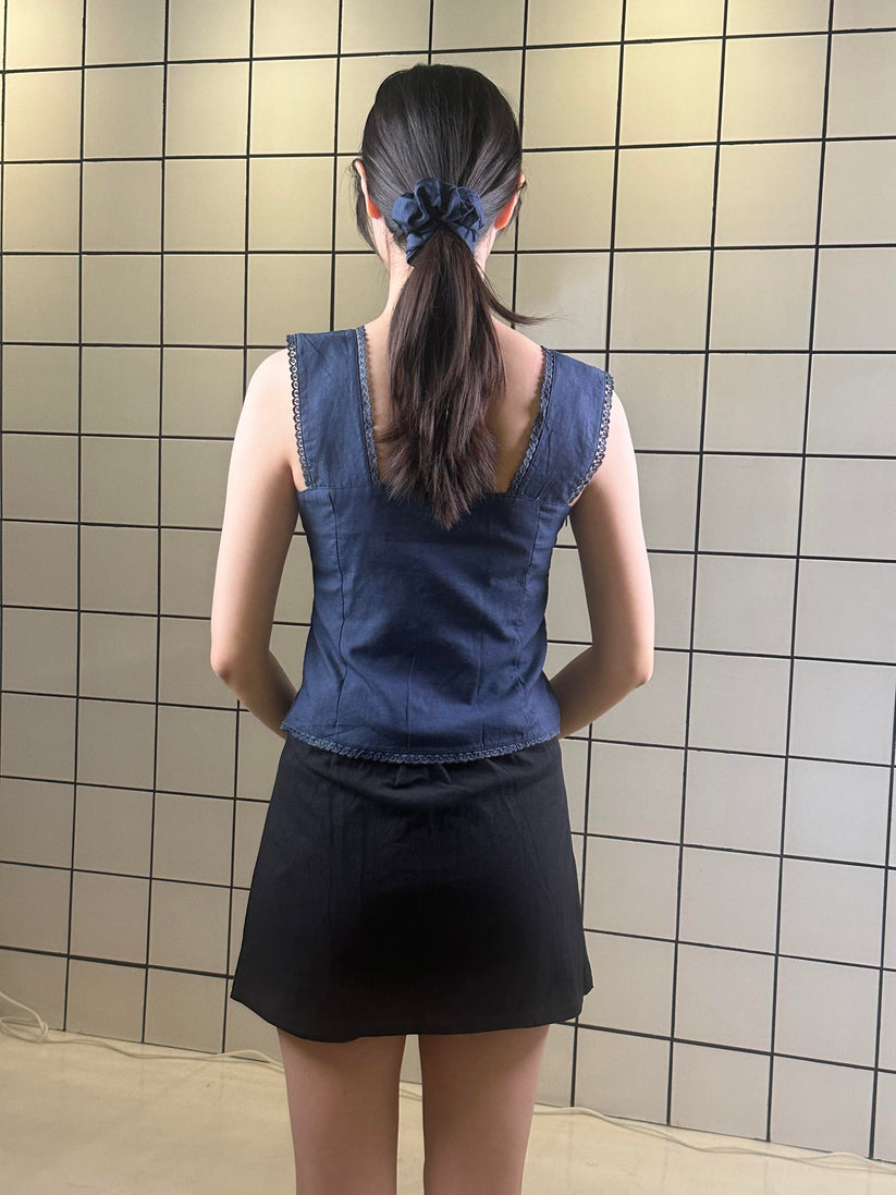 A feminine corset-style sleeveless top designed with delicate lace-trim detailing and a softly structured silhouette. Featuring a flattering square neckline with a tie-front accent, this top contours the waist while remaining comfortable for day-long wear. Each piece comes with a matching colour scrunchy for a coordinated look.