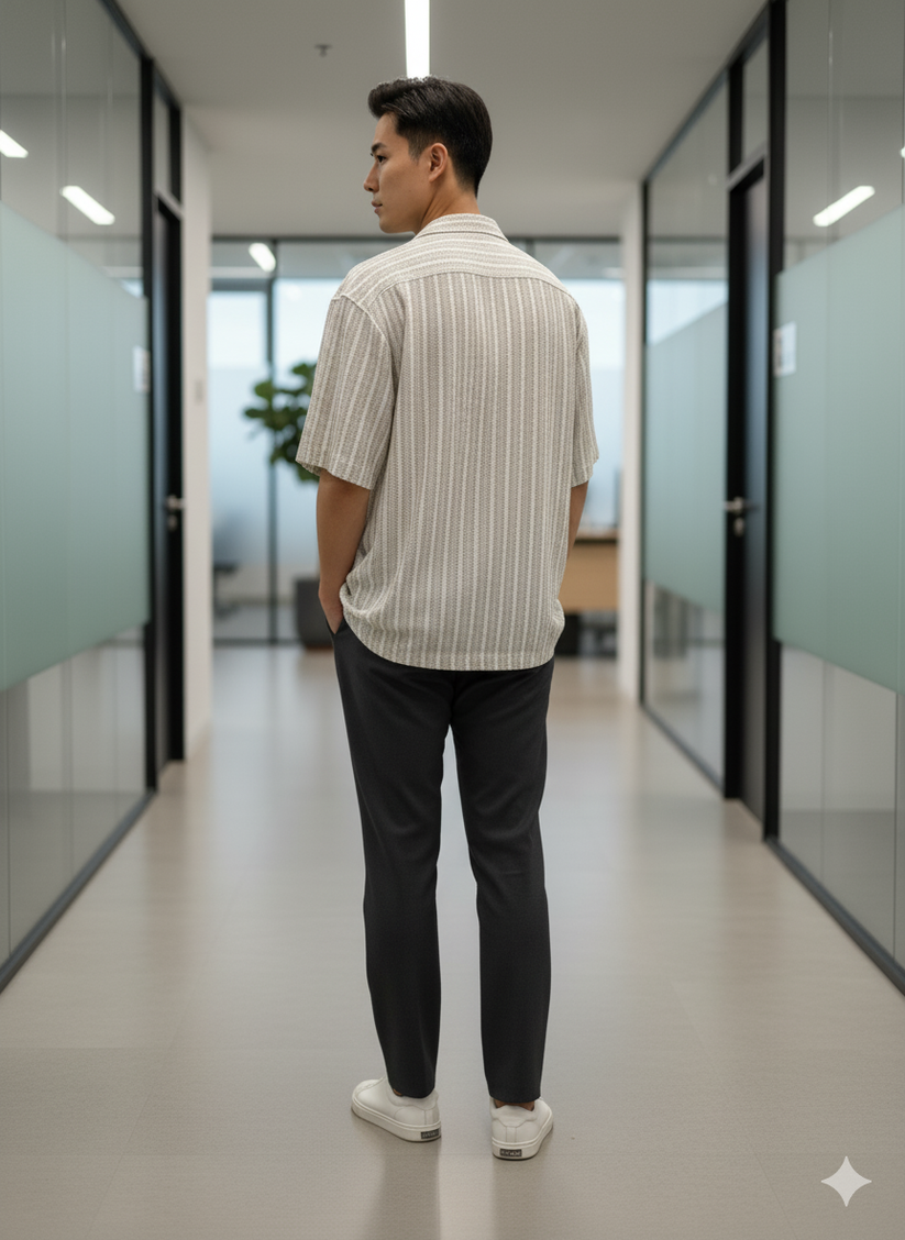A breathable short-sleeve shirt designed for effortless everyday wear. Cut in a relaxed silhouette with a soft textured fabric, this button-up features subtle vertical stripes for a clean, refined look. Easy to dress up or down, it works just as well for casual workdays as for weekends and travel.
