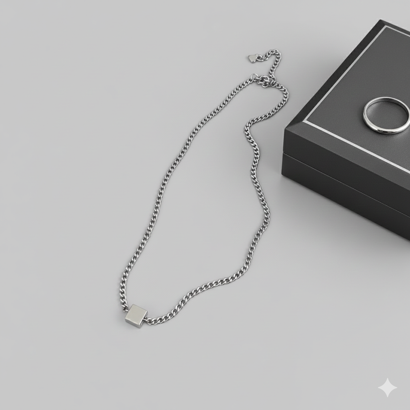 A clean, modern necklace designed for everyday wear, featuring a sleek square pendant suspended on a refined stainless steel chain. The understated geometric form adds quiet character without overpowering your outfit, making it easy to style on its own or layer with other pieces.