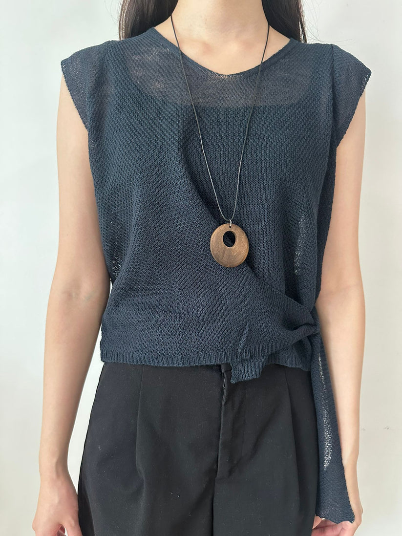 Relaxed drape with soft structure | Breathable open-knit mesh texture | Modern wrap-detail front | Extended shoulder coverage (no sleeves) | Includes matching pendant necklace | Suitable for layering or standalone wear | Length 98 cm | Bust 50 cm | Model Height: 173 cm