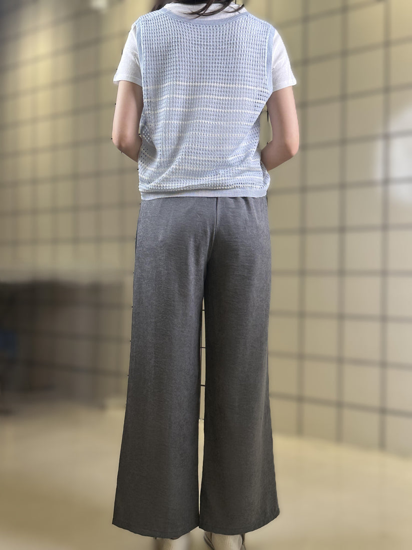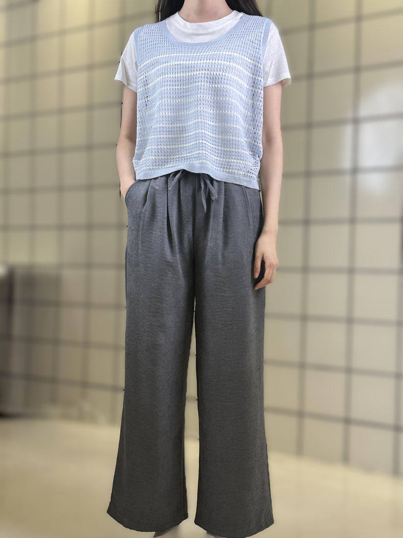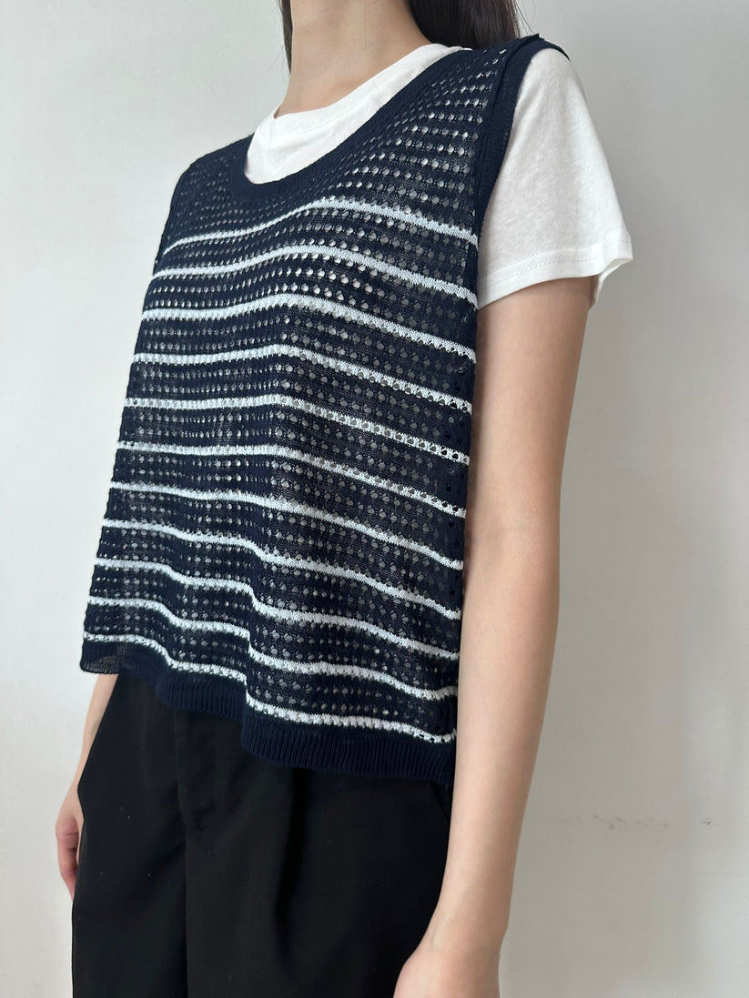 Relaxed layering silhouette | Breathable open-knit construction | Stripe detailing | Sleeveless vest cut for easy layering | Can be worn together or styled separately | Lightweight and airy feel for everyday wear | Length 53 cm | Bust 90 cm | Sleeve Length 18 cm | Model Height: 173 cm |