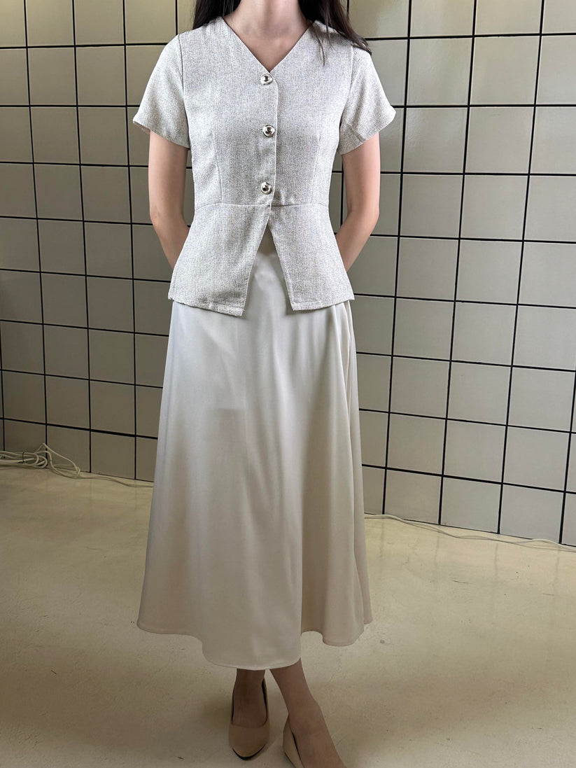 A refined two-piece set designed for effortless elegance, featuring a structured short-sleeve V-neck top with button-front detailing and an adjustable back waist tie, paired with a fluid A-line midi skirt that drapes beautifully with movement.