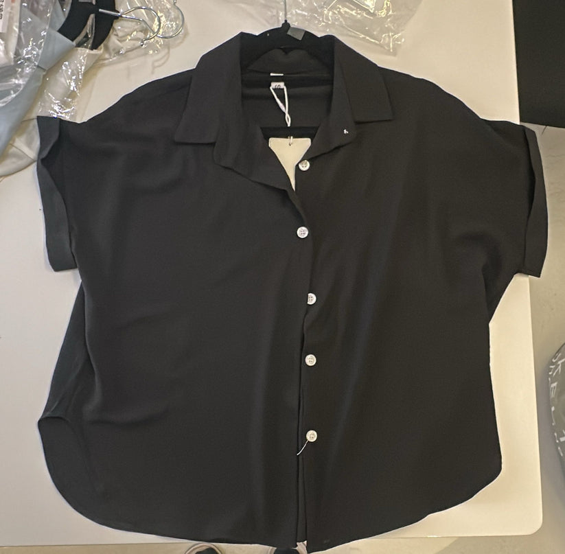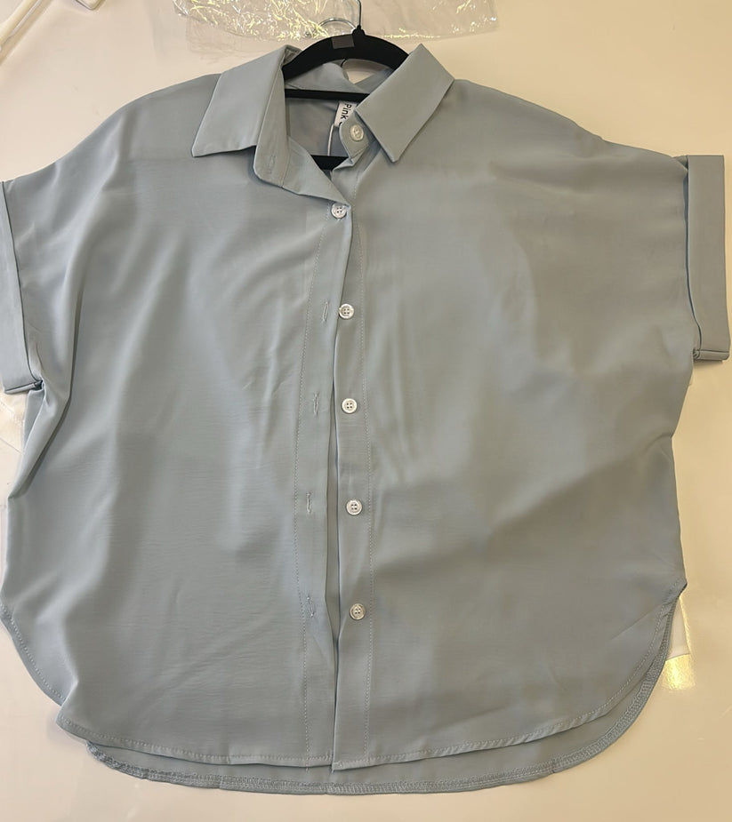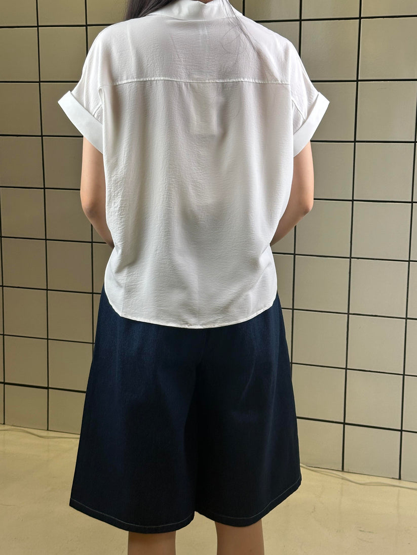 A soft drape short-sleeve button shirt designed with a folded cuff sleeve for a clean, structured finish. The relaxed silhouette allows easy pairing with skirts, tailored pants, or wide-leg trousers and works well tucked, belted, or worn loose. Lightweight fabric creates smooth flow and comfort, making it suitable for office wear, casual days, or layering under outerwear.