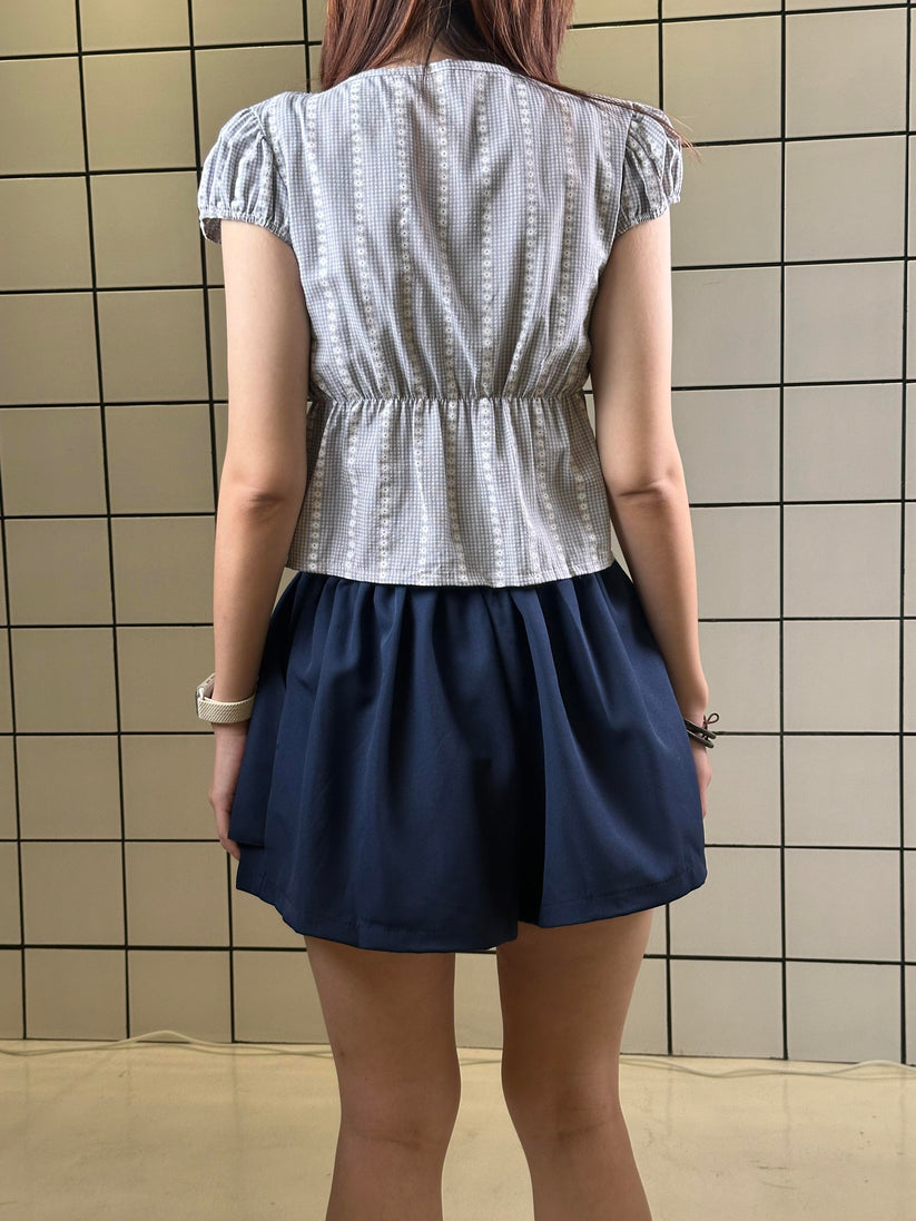 A feminine short-sleeve top designed with a soft grey gingham base and delicate embroidered floral stripe details for a vintage-inspired everyday look.