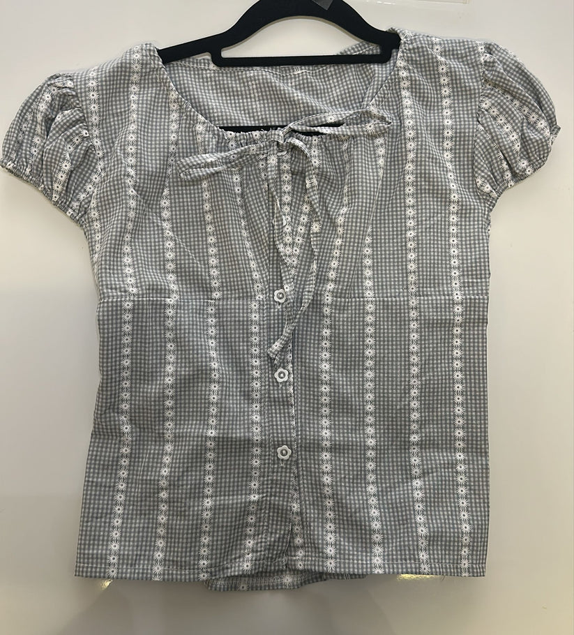 Women's Soft Grey Gingham Embroidered Tie Neck Top